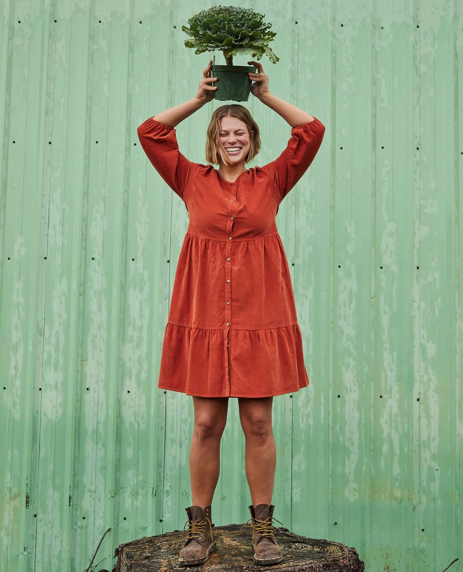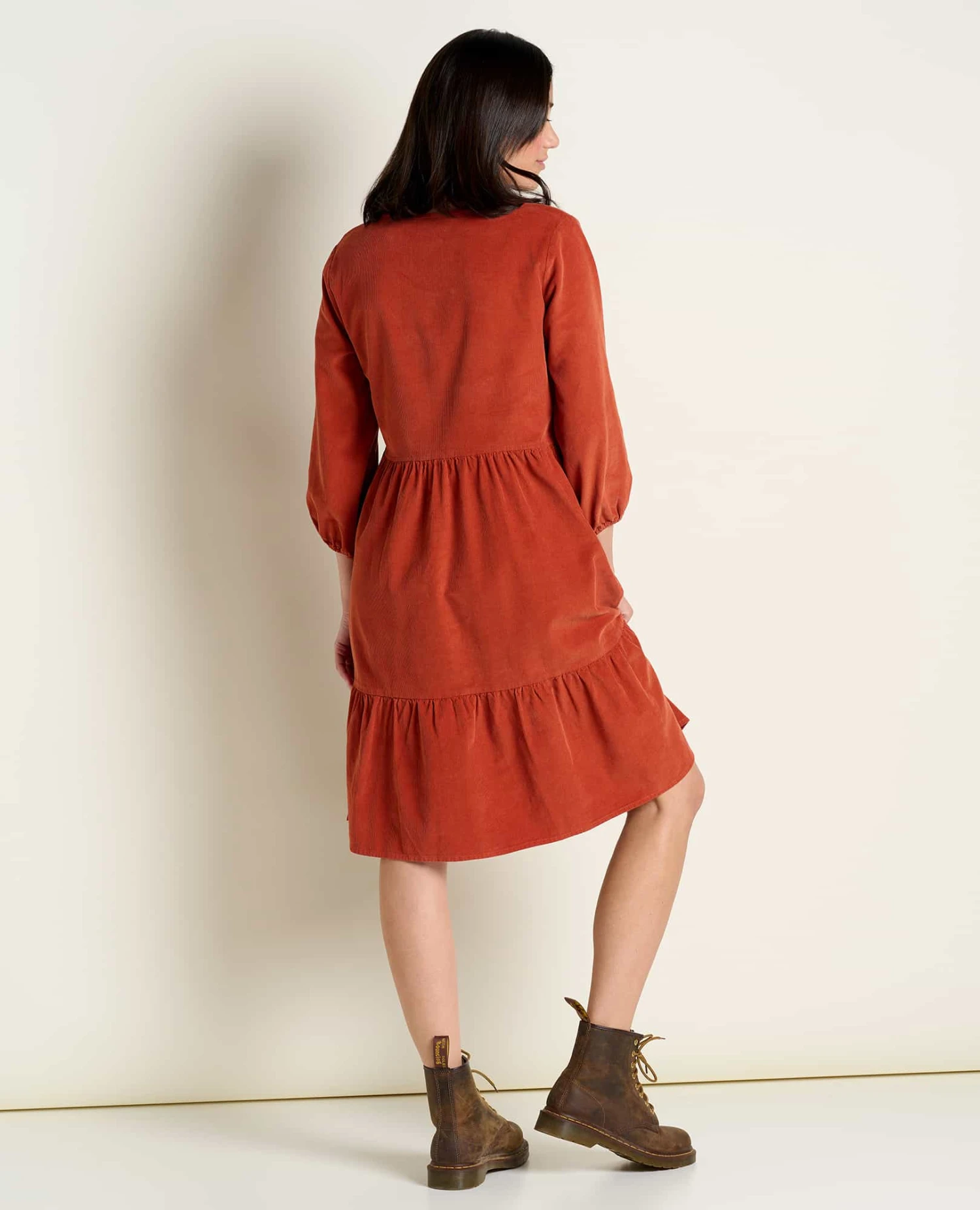 Tiered styling with cold-weather heft. Organic cotton cord creates a structured silhouette that embodies both substance and style. Full sleeves, button front detailing and hand-pockets state the obvious: This is a dress you want in your lineup.