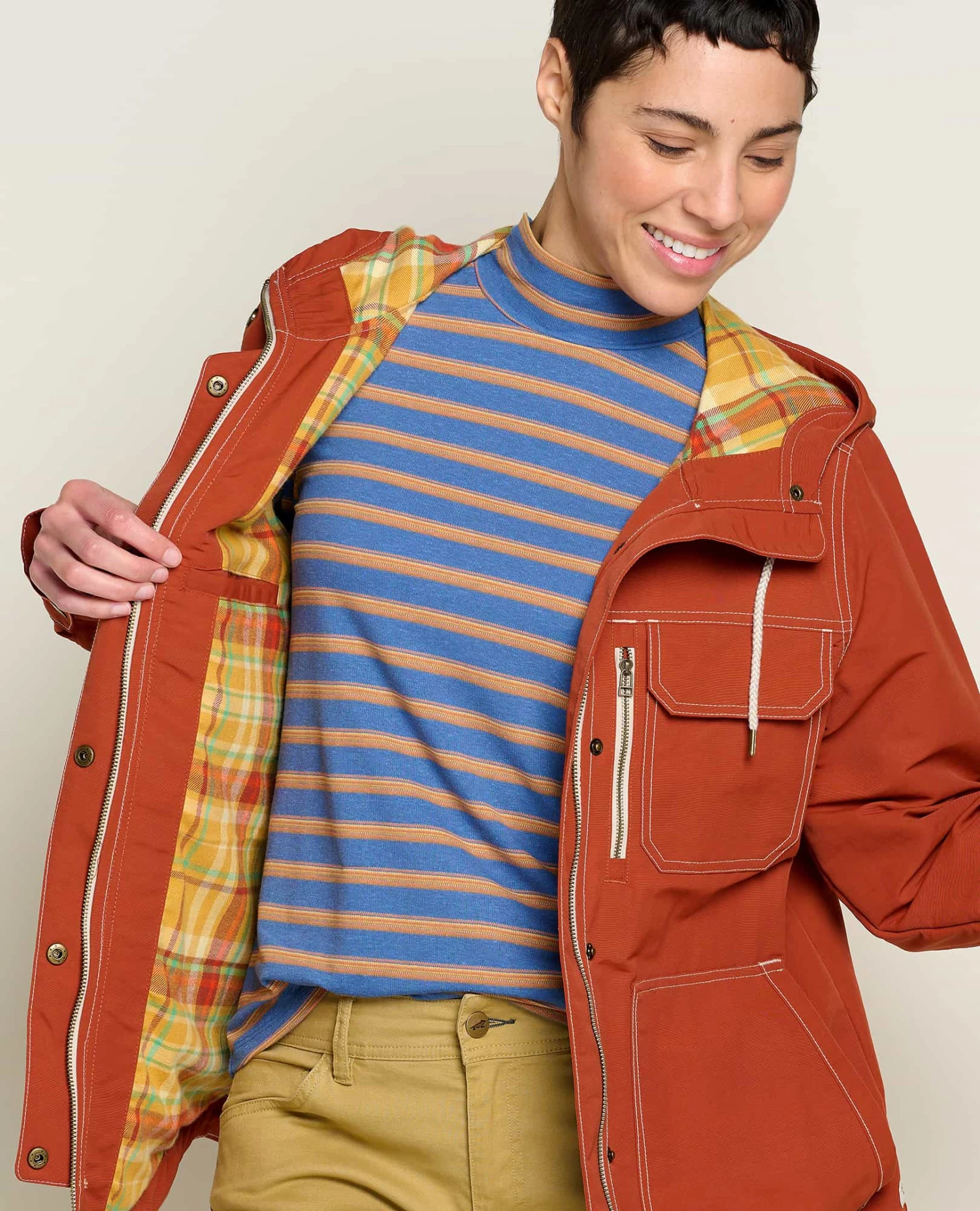 Features: Water/wind resistant with a PFC-free DWR finish, Drawcord at hood opening, snap placket with zipper closure, drop-in flannel lined chest pocket, secure zip stash pocket at wearer’s left chest, flannel lined patch pockets, adjustable cuffs, internal drawcord at bottom opening, and flannel lining
